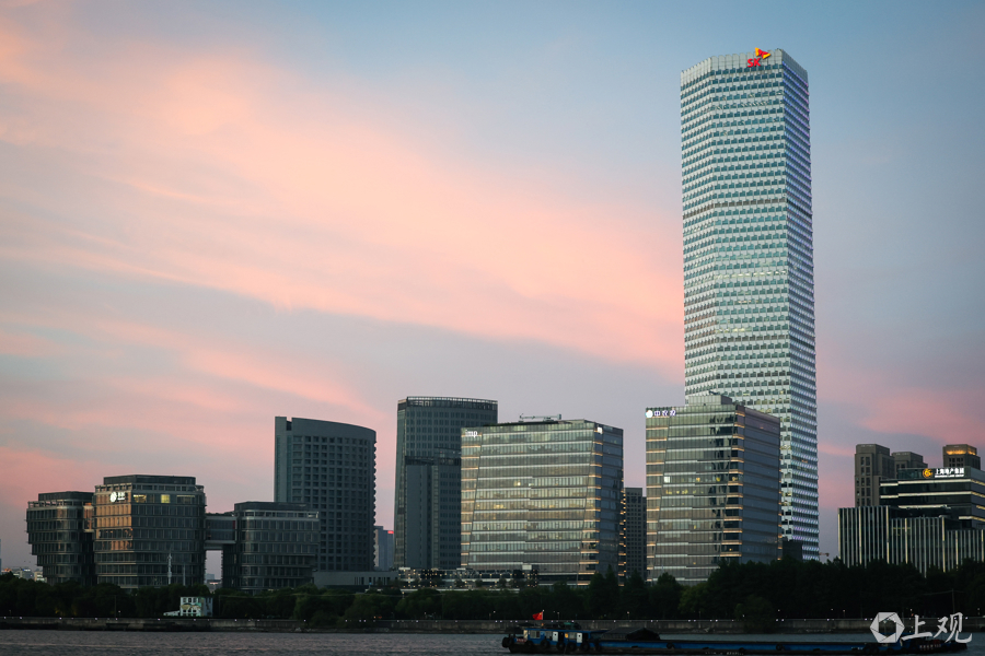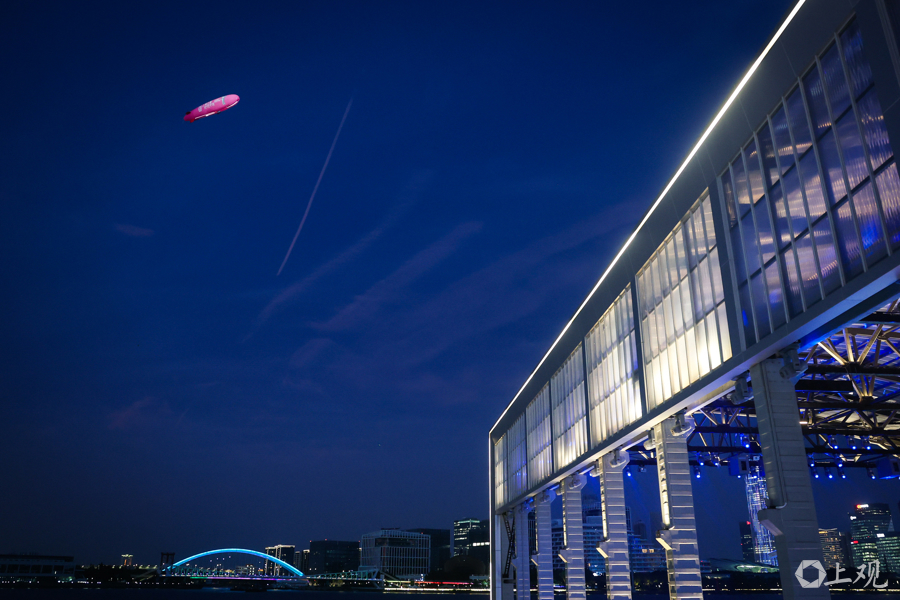 一艘印有“上海之夏,好戏开场”字样的粉色飞艇翱翔于黄浦江上空。