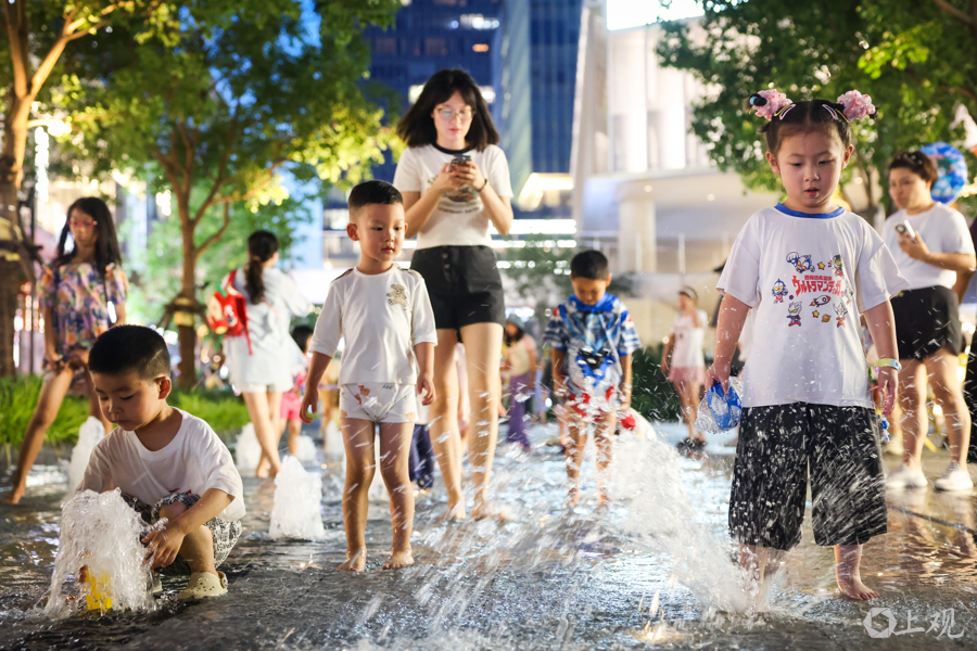 小朋友们在西岸梦中心内的喷泉周围嬉戏玩耍,欢声笑语回荡在空中,享受着徐徐的江风和惬意的时光。