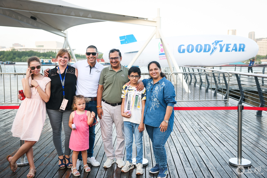 外国游客在徐汇滨江与准备起飞的固特异飞艇合影。