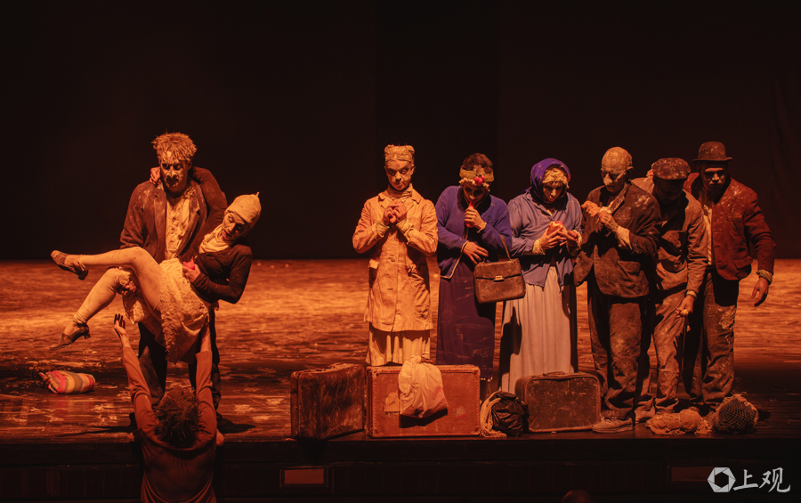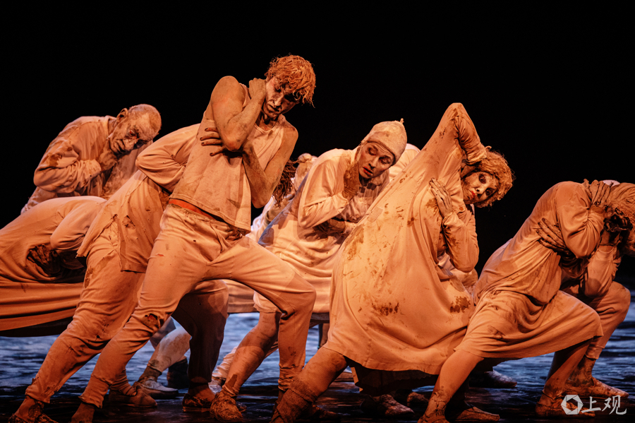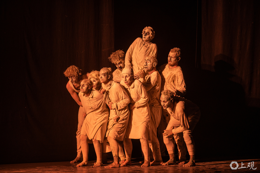 演出开场,舞台上呈现出一片荒芜的景象,10位舞者身着素色服装,脸上涂抹着灰色粉末,如同从时光深处走来的幽灵。
