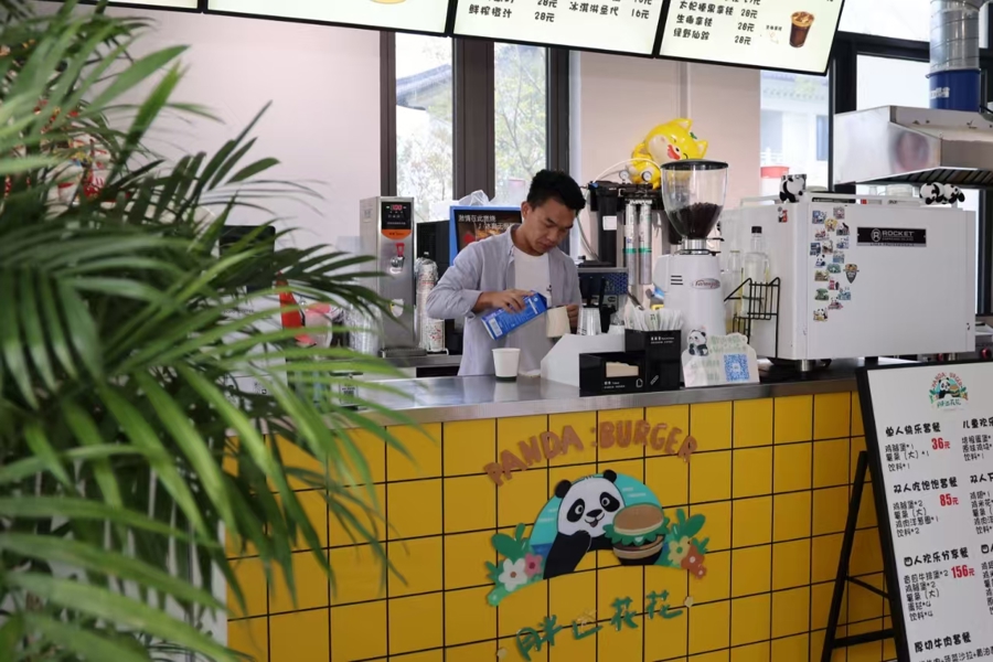 在芳香小镇商业街,“胖达花花”咖啡馆主理人徐剑正忙着调试新品。这位曾就职于市区企业的返乡青年,将位于待泾村的外婆家老宅改造成特色民宿后,又创立了这个以熊猫元素为特色的咖啡品牌。