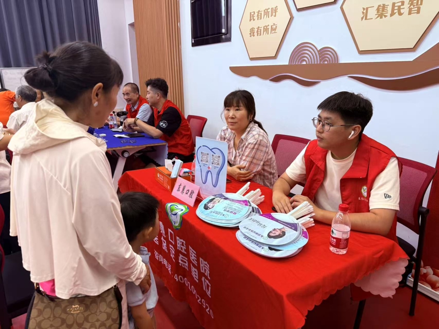 与此同时,活动现场的健康义诊区域同样人气高涨。由景红园党支部联合区域化党建单位组成的“健康服务团”带来了专业的关怀。“阿姨,你这是轻微白内障,平时注意避免强光直射。”爱尔眼科党员志愿者沈永明正耐心为居民讲解白内障注意事项。口腔检查、中医把脉、养生咨询等摊位前排起了长队。东慧口腔的党员团队现场普及龋齿预防知识;来自善夷普济中医门诊部的理疗师则现场演示穴位按摩技巧,“这个按摩法对缓解肩颈痛很有效,大家跟我学……”,吸引了不少居民模仿学习。“最近发现孩子牙齿不太好,趁着放假带他来看看口腔专家。”一位刚陪孙子完成口腔检查的奶奶笑着说道。党组织在此次联建活动中充分发挥“牵线搭桥”作用,将优质医疗资源精准下沉至网格单元,让社区居民在家门口就能享受到专业的健康服务。