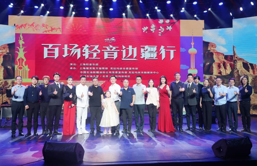 6月12日—14日,上海轻音乐团在克拉玛依演出三场音乐会。在青少年活动中心、中国石油大学和融媒体中心,乐团呈现器乐曲《金梭银梭致青春》和《叶尔羌河的声音》等原创节目,并演绎《世界赠予我的》《就是哪吒》等流行曲目。