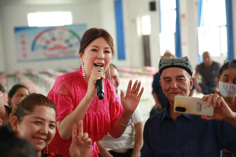 喀什叶城县,乡村舞台灯光亮起,上海轻音乐团“百场轻音边疆行”演出正在进行,一首《我和我的祖国》引起全场热情互动。乐团声乐演员肖蕊身旁,站着一位声音清澈的小歌手,她就是维吾尔族姑娘热依拉。