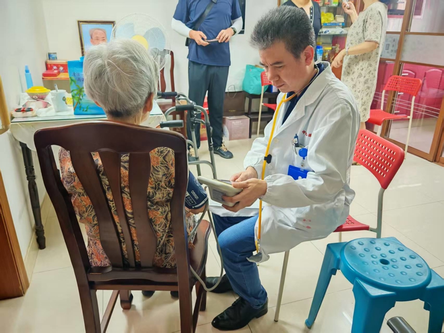 与此同时,关爱也延伸到了社区深处。急诊综合党支部书记张翔宇与社区干部一同走进新汾小区,探望91岁的独居老人崔阿婆。他们不仅为老人送上慰问品,更仔细地进行了问诊、听诊、量血压等健康检查,并提供了贴心的健康指导,确保老人安然度过酷暑。
