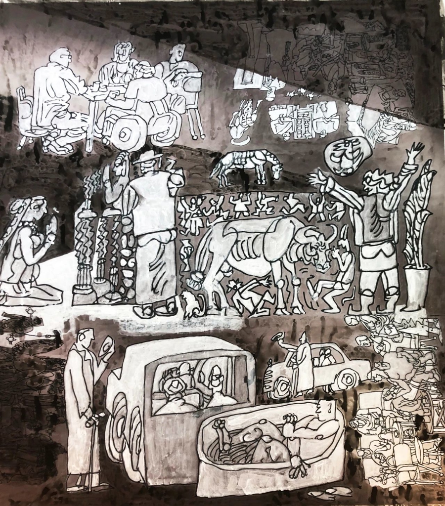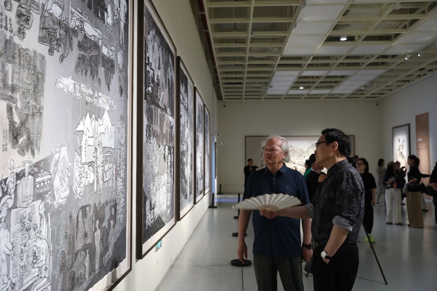 长安古道之苍茫,西域无垠之绿洲,无一不是艺术家赤子心的体现。展览以主题探索、丹青意蕴、生活写生、水墨精神四大板块,让观众感受这种创作的诚意。杨晓阳今年的新作《丝绸之路·人来人往》系列此次在上海首次亮相,以超尺幅的水墨装置重构丝路人文图谱。现场巨幅作品环绕展厅,无论是主题探索中《阿房宫赋》“盘盘焉,囷囷焉”的解构性的视觉冲击,还是《苦水社火》细密繁杂的民俗气象、生活写生中一组组截然不同的城市描绘,均表露出其扎根文化而诉诸新语的艺术哲学。