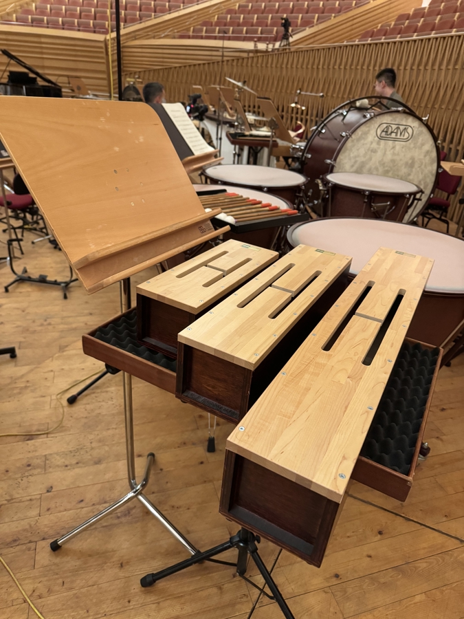 梁皓一常常在作品中使用一些不常见的打击乐器,这次在《树》中,他使用了木鱼、海洋鼓、螺旋钹、齿木响板、木鼓等。木鱼模拟了树枝相互碰撞或啄木鸟啄木的声响,他让乐手们想象自己是一个顽皮的小孩子,在树林中敲敲这个,敲敲那个。即兴演奏创造出一种沉浸式的听觉体验,让观众仿佛置身于森林之中,听到四面八方传来的自然声响。除了使用不常见的乐器,梁皓一也让许多常见的乐器发出了不同寻常的声音。