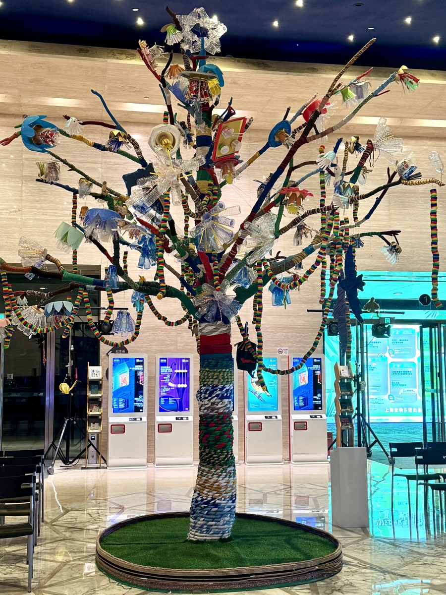 在今年上海夏季音乐节,“树”是不可忽视的主角。走进捷豹上海交响音乐厅大厅,就能看见一棵特别的树。艺术家米拉在三江源带领当地牧人一起收集垃圾,编织成了这棵树。米拉相信,这不仅是一件用垃圾做成的艺术,也是一棵承载着大家环保信念的“重生之树”。它不算枝繁叶茂,却会因为人们的环保行为而持续生长。