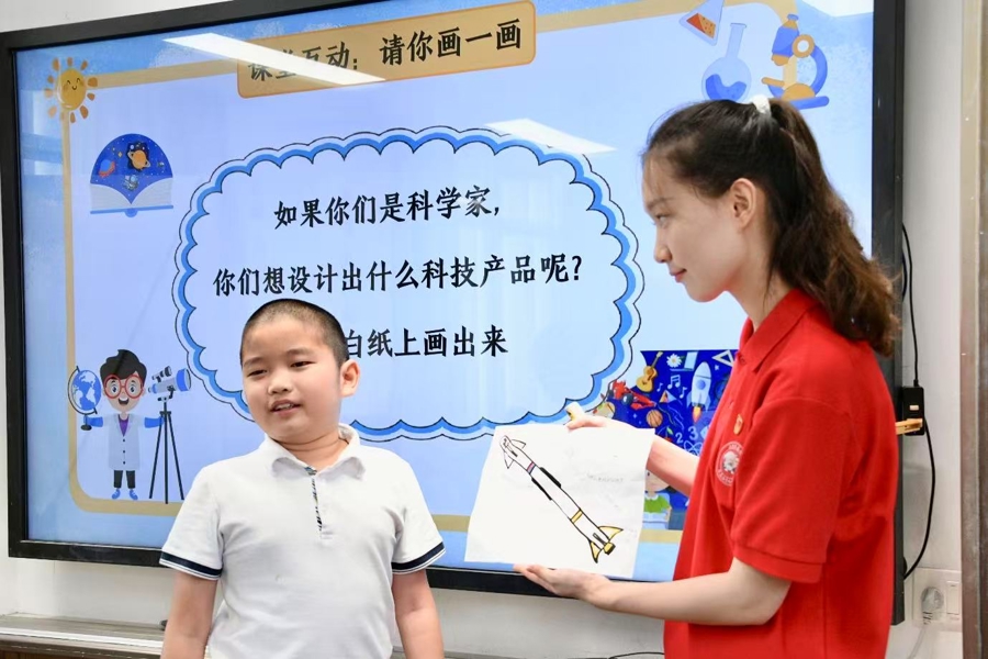 为进一步培养少年儿童的科技创新意识,团市委联合上海师范大学,面向全市爱心暑托班开展“高举队旗跟党走 争当科创小先锋”主题开班教育活动。记者看到,上海师范大学研究生李姝凝作为授课教师,正向学生讲述1960年发射的T7M探空火箭、在上海完成总装的国产大飞机C919……在孩子们求知的眼神里,种下一颗小小的科技种子。“我们希望通过这一类型的课程,春风化雨地浸润孩子们。”李姝凝说。