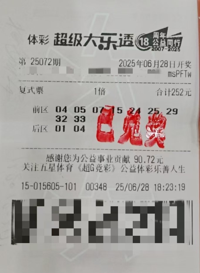 6月28日,超级大乐透25072期开奖。前区开出号码04、07、15、24、29;后区开出号码01、04。上海中得一等奖的是一张大乐透“9+2”复式票,彩票金额为252元,单票中奖1007万余元。大奖出自宝山区真华路1480号,体彩编号为15605的体彩代销网点。