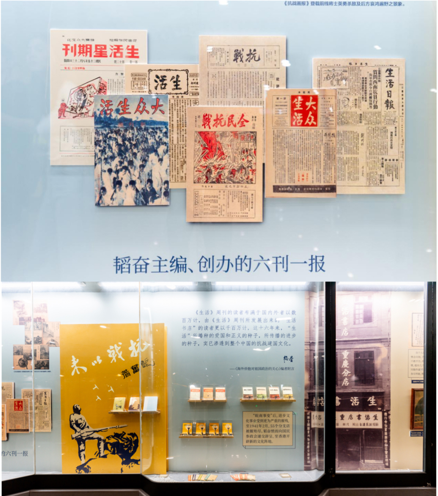 “救亡图存的文化战士”板块通过生活书店抗战书报墙、《抗战以来》大型仿真书等装置设置,集中展示三十余份书报刊,呈现韬奋及生活书店如何凭借进步出版,将爱国和正义的种子传播,指引无数青年奔赴抗日救国的战场,鼓舞亿万抗日军民战斗到底。