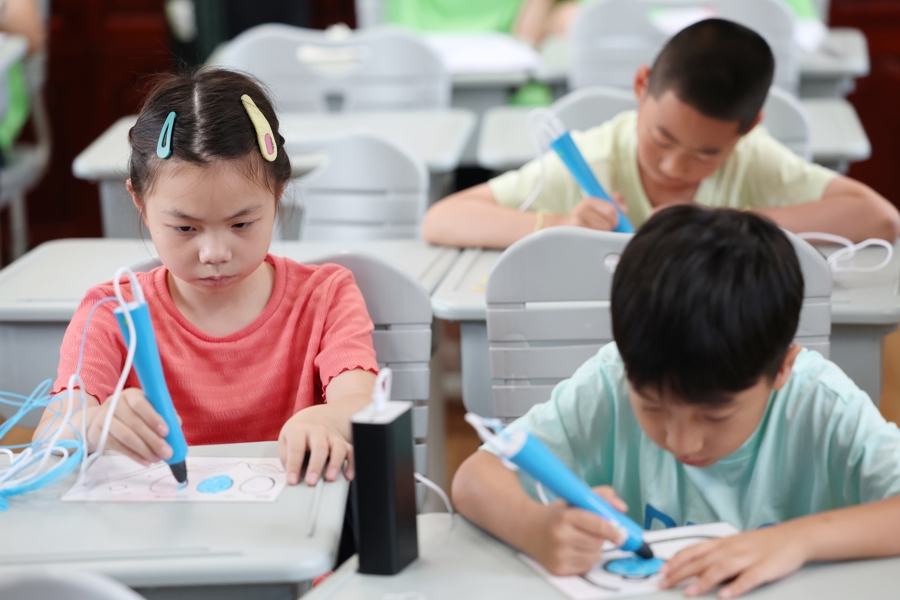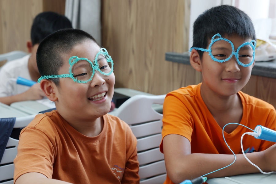 “你们心中的科技成就有哪些?”在位于西南位育中学西校区的徐汇区田林街道办班点开班主题活动上,暑托班志愿者、上海师范大学学生李姝凝正带领孩子们探索当今科技的发展。上海既是“魔都”,也可以是“模都”,为培养青少年的科技创新意识,暑托班将3D打印等技术融入课程,从可佩戴的眼镜到能组装的立体花朵,孩子们用3D打印笔制作出各式各样的立体玩具。