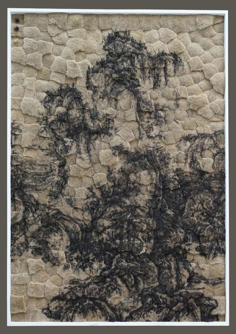 比如梁国兴的《“摹”系列》作品,以制作中国毛笔的重要材料之一马鬃为创作材料,借北宋大家郭熙的《早春图》作为创作的“源”图像,并通过马鬃的黑、白、棕三种毛色的构置来模仿中国传统绘画中的墨韵。作品以鬃为绢,以鬃为墨,旨在在具有凹凸的二维空间中“意”中国传统山水画的墨色晕染的流变与郭熙的早春之境。