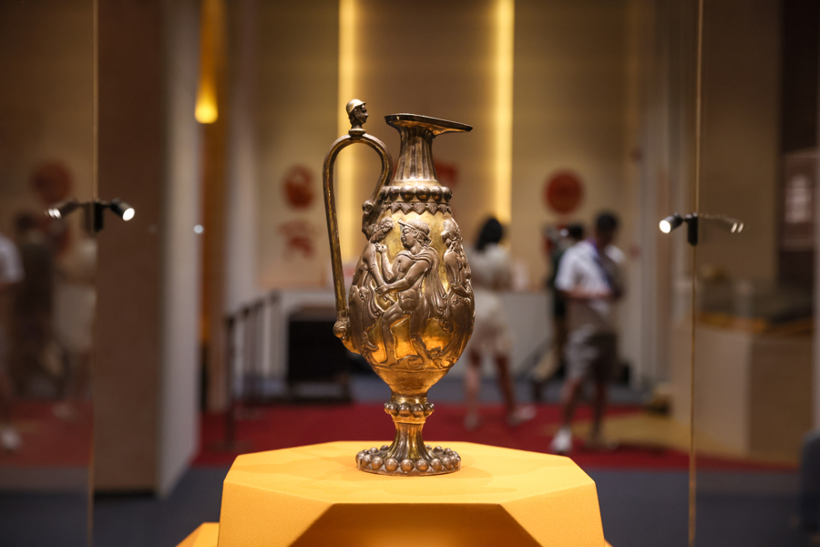 宁夏固原博物馆的三件镇馆之宝,此次来了两件,另一件是有着极高“曝光率”的鎏金银壶。其形制规整,工艺水准与图案内容在世界现存萨珊金银器中都极为罕见。银壶颈部的棱状凹槽样式与古希腊建筑中的廊柱相近,壶身用立体浮雕的形式表现出三组青年男女人物形象,有研究者认为该画面表现的是古希腊“帕里斯裁判”和“特洛伊战争”故事。它由中亚工匠制作而成,承载着希腊故事,装饰着波斯纹样,又通过丝路贸易传入固原地区,将欧亚大陆上的希腊文明、波斯文明和中华文明串联了起来。