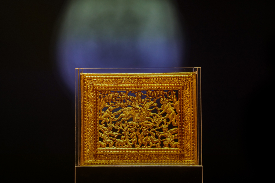 本次展览中,最夺目的是狩猎图金方奇。这件隋代器物长18厘米,宽14厘米,厚1厘米,由黄金雕刻,重达850克,置于展柜中发出耀眼的金色光芒。“方奇”,在文献中意为各地出产的珍奇物品。此件金方奇一面镂刻细节丰富的狩猎图像和蔓草纹花边框,另一面刻82字隶书铭文。仔细看,从内向外分为四重结构,画面内容细节丰富,体现了多元文化交汇地区文明和谐共生。