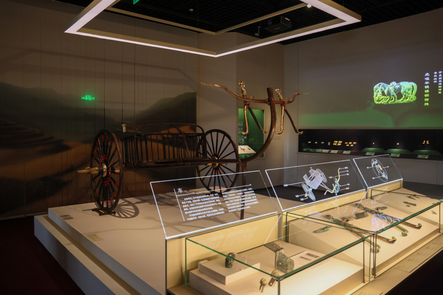 步入展厅,映入眼帘的是置于独立展柜的一件铜簋。它出土自孙家庄西周墓地,腹部两侧饰有半圆形耳,颈部以云雷纹作底纹,并饰一周带状兽面纹,足部饰一周带状夔龙纹。该铜簋与同遗址出土的铜銮铃、兽面纹铜车轴饰等青铜器,证实了西周早期周人的统治势力已至今天的固原地区。
