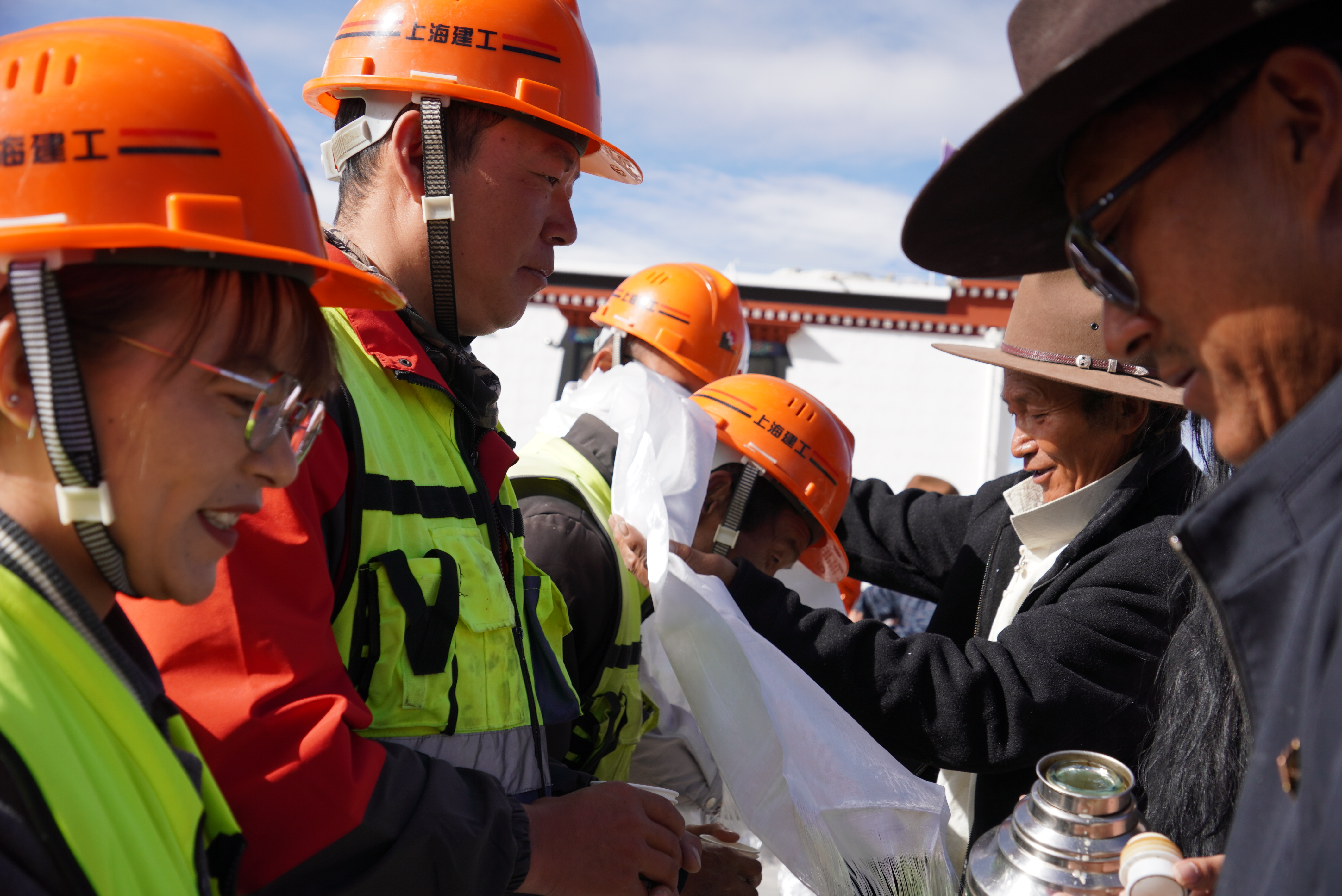 今天是个大日子。原本已经错过的“拖羌”在当地干部和上海建设者的沟通下,换了一种形式,热烈进行。73岁的卓嘎老人一大早就带着面包点心,从临时安置地赶到建设中的森嘎村,见到工人就塞,普通话没学会几句,只一连串道“谢谢”。