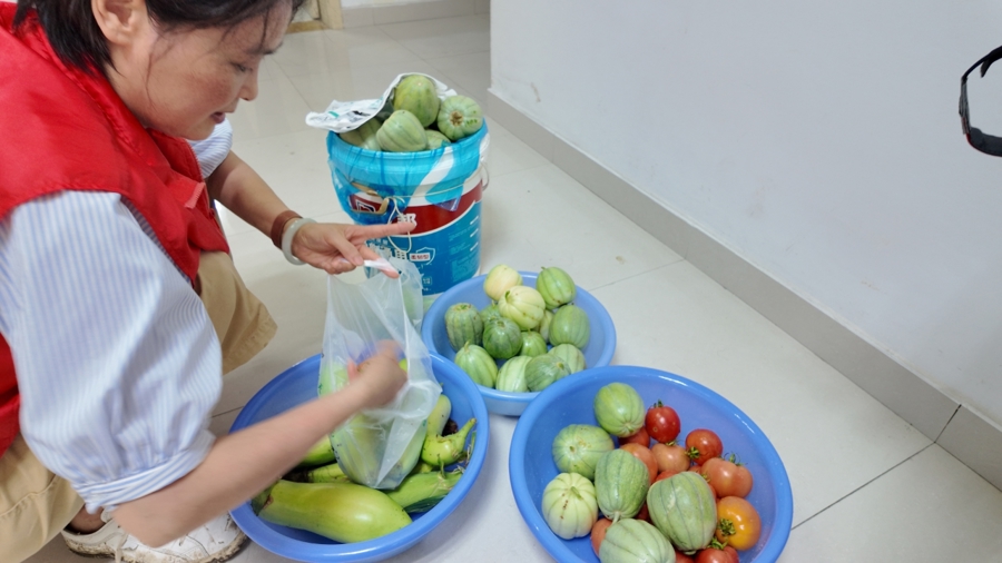 上午十时许,记者来到山阳镇香颂湾小区,党员志愿者等“爱心菜园”管家团队成员正在清洗新鲜采摘的蔬菜瓜果,并将这些蔬果装进袋子中,随后送到独居老人和孤寡老人手中。接过袋子,居民张阿姨熟练地将蔬果放进冰箱里。她告诉记者,今年以来已收到好几次“爱心菜园”的蔬果,这些新鲜可口的绿色食材虽不贵重,却很温暖。