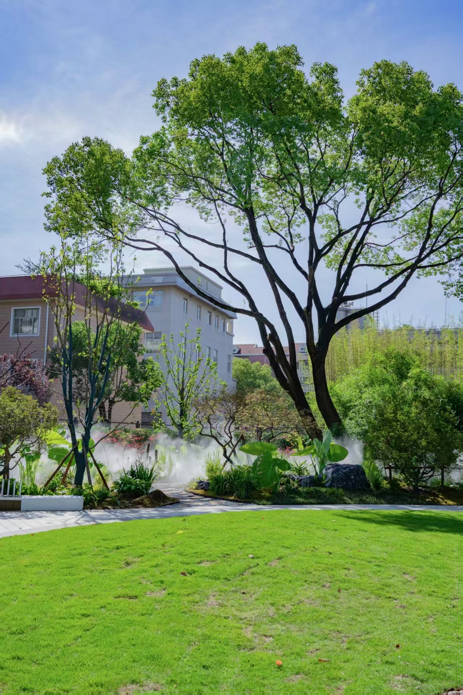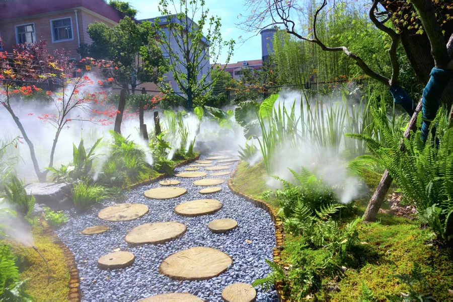 公园里,玉兰花瓣造型的廊架现代简约。白玉兰、红玉兰、紫玉兰的图片镶嵌其中。沿小路往里走,云雾缭绕,仙气飘飘。原来这是特为耐阴花境制作的雾森系统。多种耐阴植物排列组合,其中一种叶子巨大,酷似大象耳朵,它叫象耳芋,叶子直径足足五六十公分。炎炎夏日,雾森系统每10分钟“吞云吐雾”一次,每次约10分钟,一方面改变植物生境,另一方面增加湿度和负氧离子。