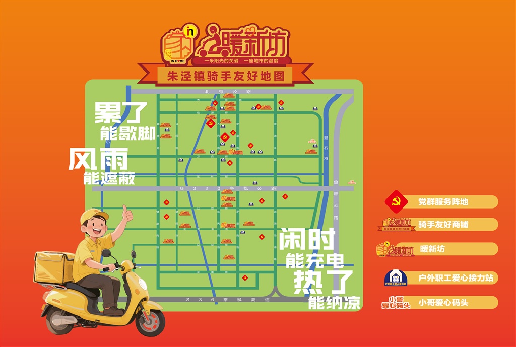 值得一提的是,活动当天还发布了《朱泾镇骑手友好地图》。该地图融合了镇域各级党群服务阵地、街区“暖新坊”、户外职工爱心接力站、骑手友好商铺等资源,围绕新就业群体刚需,将镇域零散分布的充电、停车、就餐、休憩、学习等个性化服务点位串珠成链,方便他们快速就近获取帮助和保障。