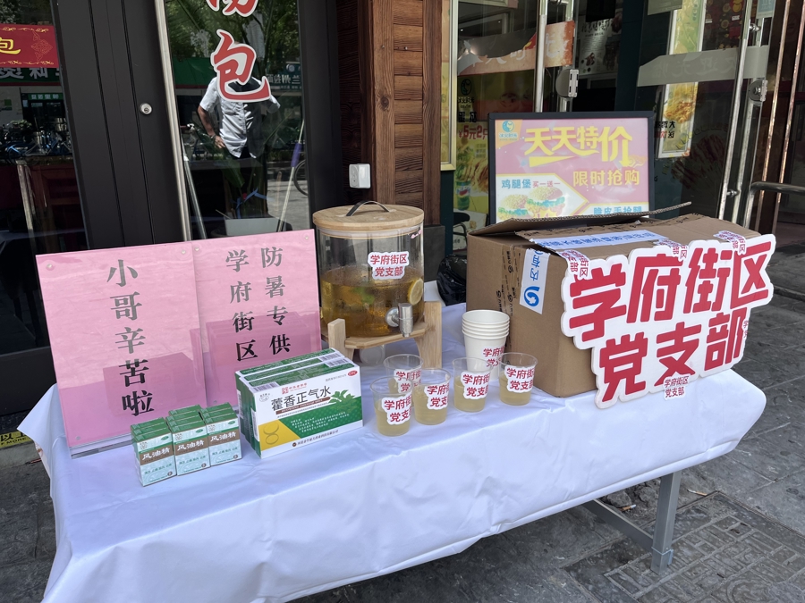 此外,活动当天,学府街区还开展了“夏日送清凉”活动,为外卖员、快递小哥、环卫工人等新就业群体送上了风油精、凉茶、藿香正气水等消暑降温用品。