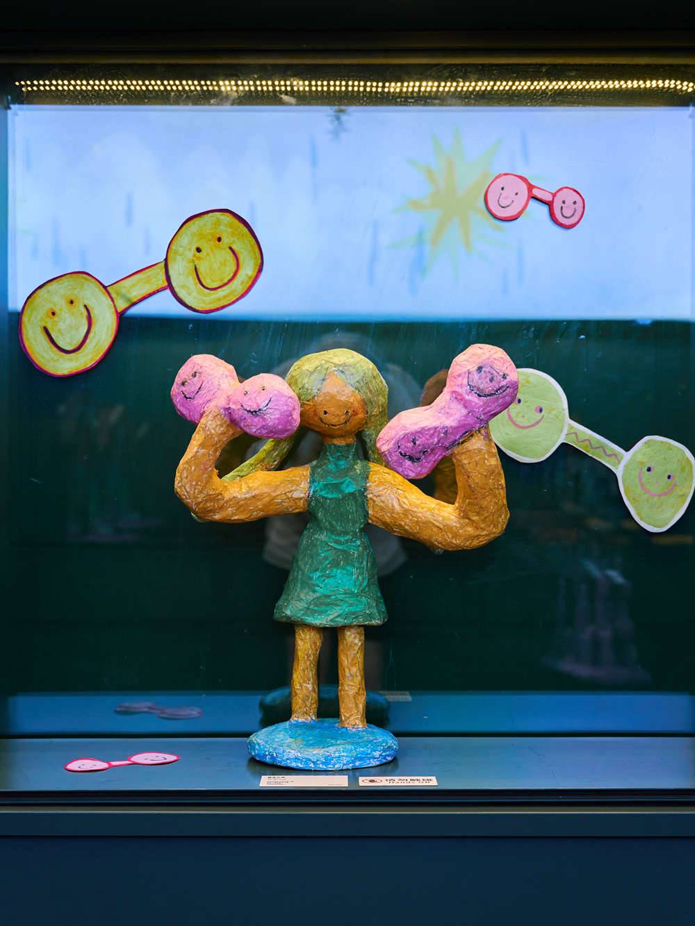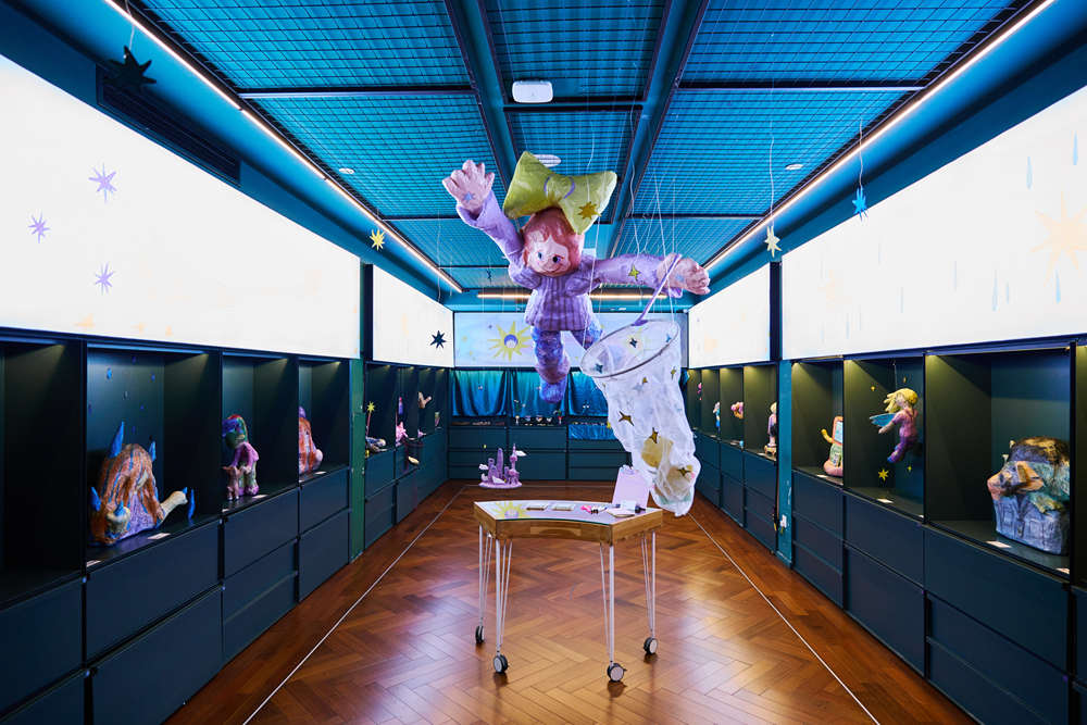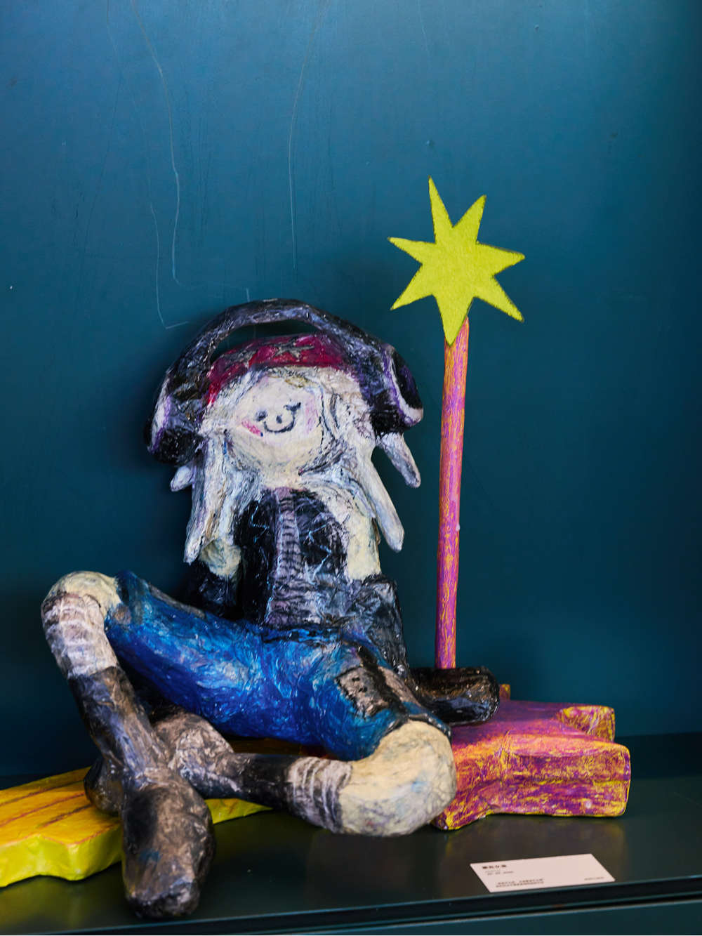 展厅中央,一个呈现自由“大”字状飞翔姿态的巨型女孩纸雕塑被悬挂在空中。她脚下后方是她出发的城市缩影,女孩手里抓着星星魔法棒和魔法收集网。看到她,仿佛听到召唤:每个女孩张开双臂,都有改变世界的力量!观展时仰视她的角度,也是一个拥抱的姿态,可以拥抱一切你热爱的事物。