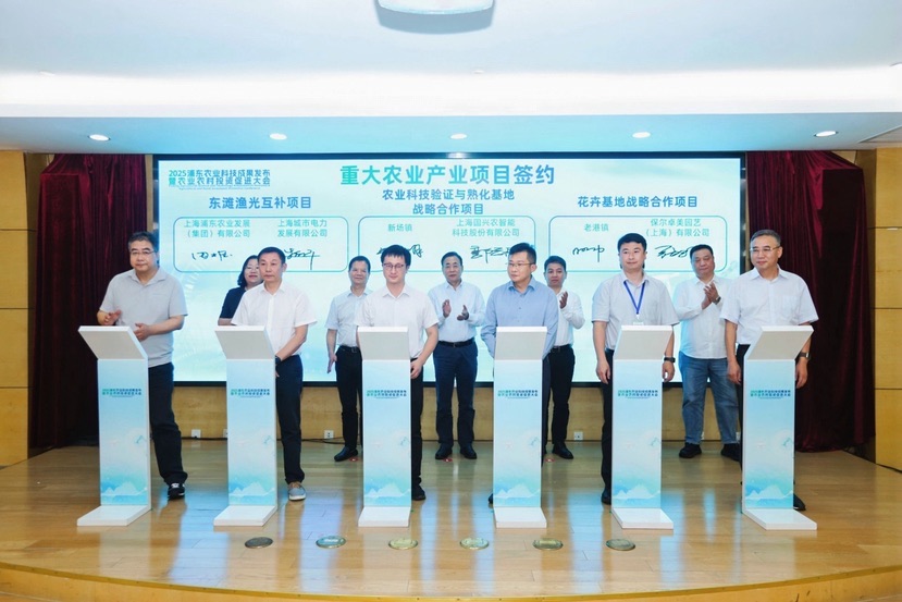 在浦东农业科技成果发布环节,浦东领军企业带来突破性进展,硅羿科技(上海)有限公司发布了RNA生物农药,以生物科技赋能绿色植保,推动农业病虫害防治技术升级。滴翠智能科技(上海)有限公司展示了激光除草机器人,融合人工智能与农业机械,助力农田管理智能化、高效化。上海光催化产业技术研究院分享了光催化应用科技成果,探索光催化技术在农产品保鲜、农业环境净化等领域的实践。绿技行(上海)科技发展有限公司呈现了绿色低碳技术开发与转化成果,为农业可持续发展提供低碳解决方案。四项成果覆盖生物防治、智能农机、环保科技与低碳转型,彰显浦东农业科技“硬实力”。招商推介环节聚焦浦东乡村振兴核心承载区,张江种谷依托张江科学城科创生态,打造国际种业创新高地。五大乡村产业项目特色组团,川沙新镇、惠南镇、大团镇、老港镇、泥城镇分别发布了招商资源信息;北蔡·第六元素未来空间、合庆医立方园区探索集体经济高质量发展新模式,发布平台公司招商信息。同时,现场进行了绣云里开元名庭酒店项目、合庆医立方项目以及壹福绿色食品产业中心项目三个集资高质量发展项目的签约仪式,以及东滩渔光互补项目、农业科技验证与熟化基地战略合作项目、花卉基地战略合作项目三个重大农业产业项目的签约仪式。(主办方供图)