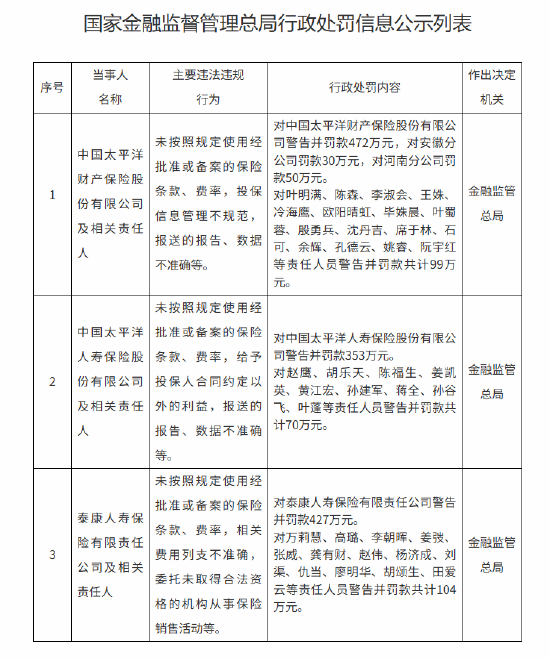 据金融监管总局行政处罚信息公开表显示,泰康人寿保险有限责任公司因未按照规定使用经批准或备案的保险条款、费率,相关费用列支不准确,委托未取得合法资格的机构从事保险销售活动等被警告并罚款427万元。同时,万莉慧、高璐等责任人员因未按照规定使用经批准或备案的保险条款、费率,相关费用列支不准确,委托未取得合法资格的机构从事保险销售活动等,被警告并罚款共计104万元。