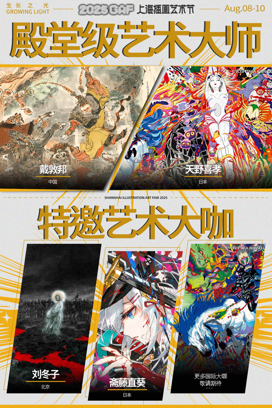 本届插画艺术节以“生长之光”为主题,呈现七大主题展区及20余场活动,将为上海乃至全国的艺术爱好者打开一扇瞭望全球艺术潮流的窗口。其中,最大亮点当属两位艺术大师特展——日本艺术巨匠天野喜孝、中国画家戴敦邦将赴现场交流,为盛夏申城注入艺术活力与想象力。