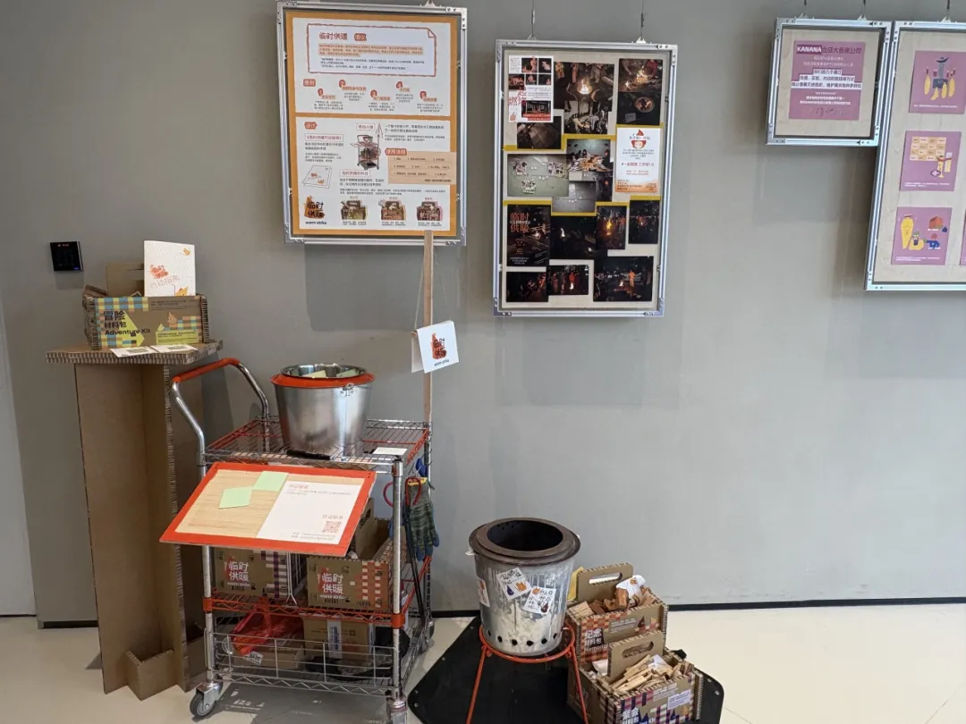本次展览的参展展品包括何楚珩“几何形”、雷昊玥“Patch Up:基于可持续设计理念的社区剩余空间临时使用”、顾雅菲“波诺波诺文创品牌”等。在众多展品中,“临时供暖”倡议和冒险材料包尤其引人注目。冒险材料包中摆放有苹果木条、苹果木块、引火麻丝、松明子等主燃料和一次性交换物,并且还提供了一份自备物清单,包括石子、落叶、砖块、花草、报纸、炭条等。
