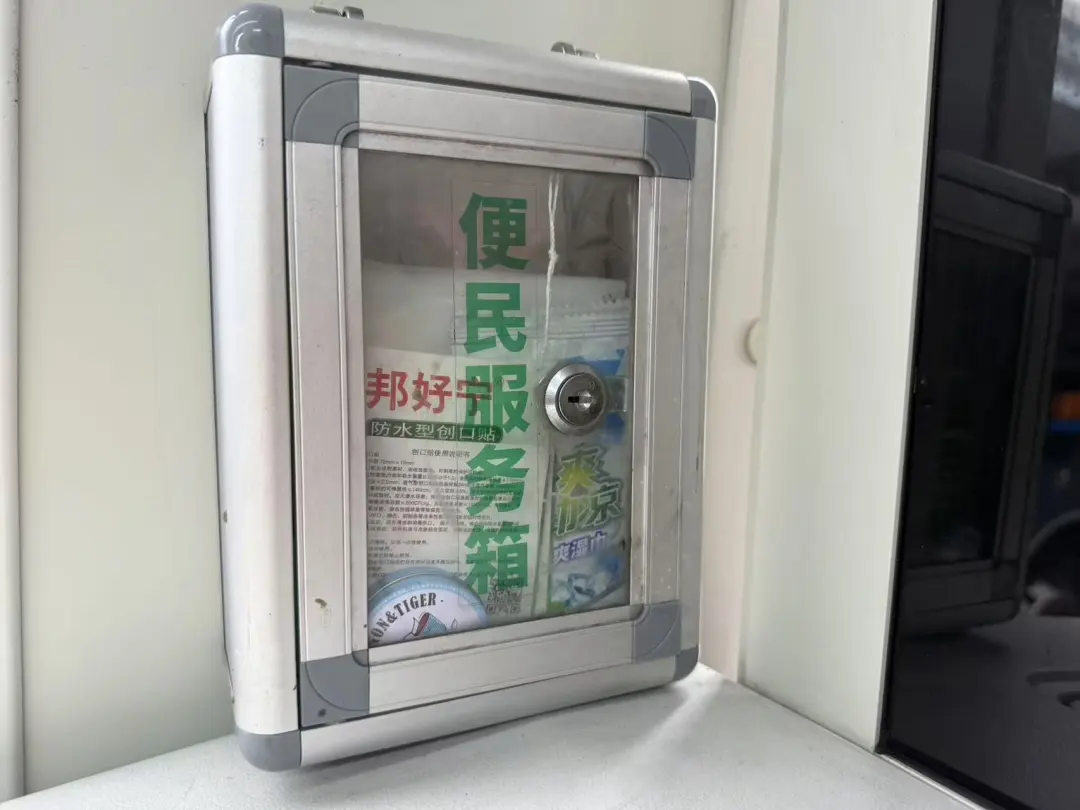 记者注意到,55路公交车上的适老化改造,远不止于无障碍设施。在车厢里,便民服务箱成了“百宝箱”,里面口罩、风油精、创可贴等应急物品一应俱全。“上周有位阿婆突然头晕,我们马上提供了风油精。”驾驶员江飞告诉记者,便民服务箱会定期更新物资,为了应对最近的高温天,还特意新增了清凉湿巾。