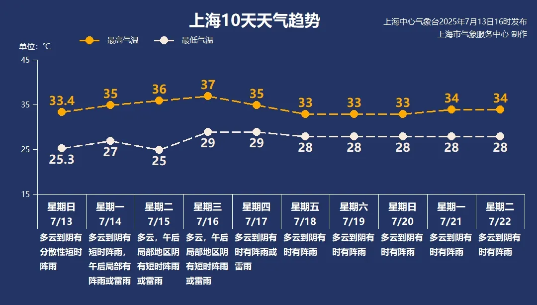 随着副热带高压加强,本周高温天气重新回归申城。预计周三最高气温可达37℃,为近期气温高点。配合高温一起回归的还有常见的午后降水,熟悉的配方熟悉的味道,大家在防暑防晒的同时也要提防午后“下开水”。本周后期气温稍有回落,全天气温多在28-33℃之间,本市多阵雨,提醒大家关注最新的预报和预警信息。