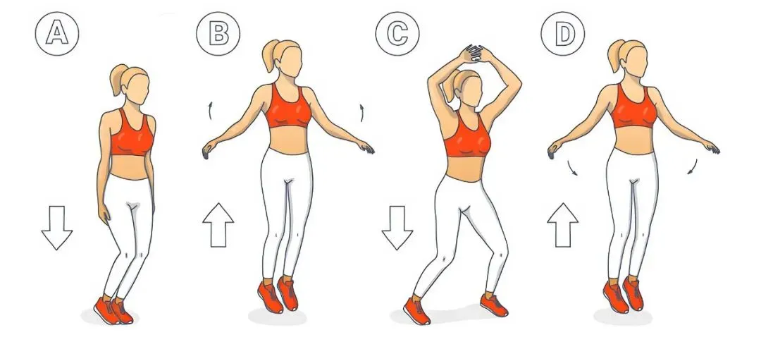 站立,双脚与肩同宽,双臂自然垂落;臀部向后坐,做深蹲动作,膝盖不超过脚尖,双臂向前伸直;从深蹲姿势起跳,尽量跳高,同时双臂向后摆动;落地时回到深蹲姿势。