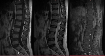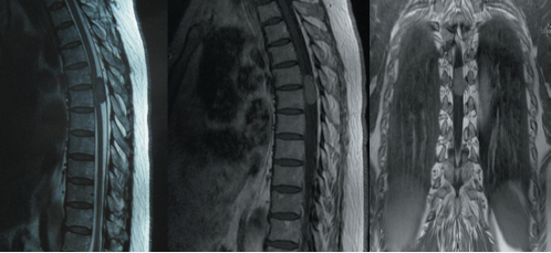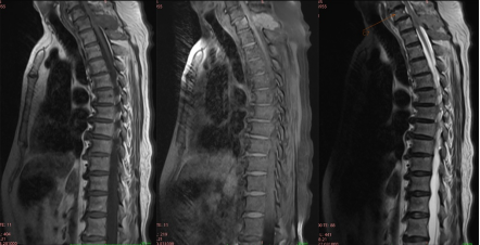 图7.胸椎髓外硬膜下脊膜瘤MRI图像