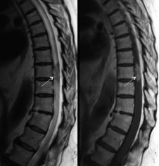 是指位于脊髓外部、硬脊膜下方的肿瘤,就像电缆中金属导体与绝缘层之间的部分。脊神经肿瘤和脊膜瘤(图6、7)较为常见。它们的发展过程通常比较缓慢,在早期可能会引起根性疼痛,咳嗽或打喷嚏时症状可能加重。有时还可能出现脊髓半切综合征,表现为同侧肢体无力以及对侧肢体感觉减退。