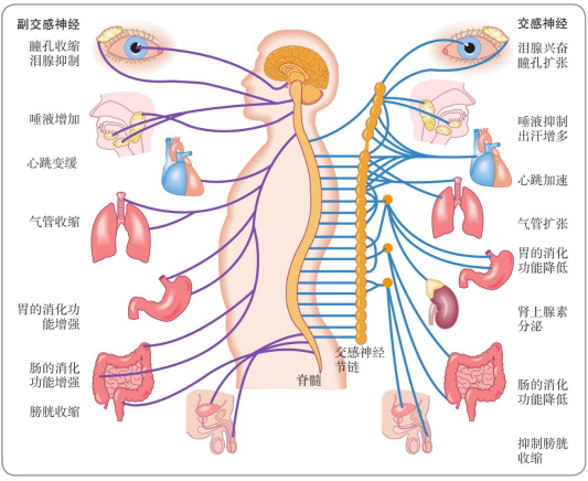 胸髓(T1-T12):主要控制躯干和腹部的肌肉活动(如维持姿势),负责躯干和下肢的部分感觉(如冷热、痛觉),并包含调控内脏功能(如部分胃肠活动、血管舒缩)的交感神经中枢。