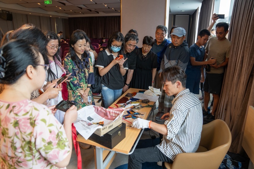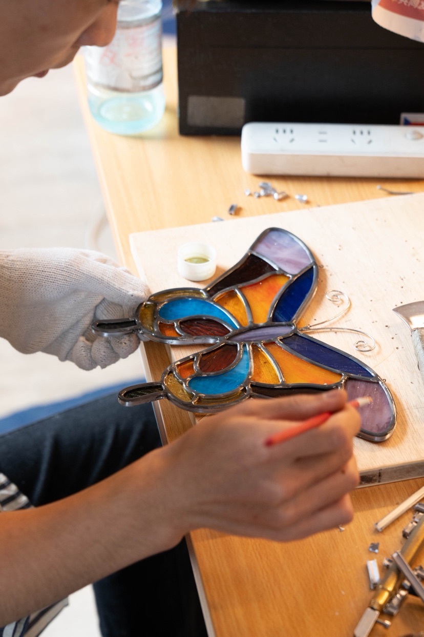 活动现场还设置了彩绘玻璃制作演示环节。观众们围在制作台旁,见证了普通的玻璃如何通过重重步骤,最终变成一件精美的蝴蝶造型彩绘玻璃作品。彭阳的助手技法娴熟,观众们对此赞叹不已,有人询问定制价格,有人好奇玻璃的固定方式,还有人希望能参与彩绘玻璃工艺体验,现场气氛热烈融洽。