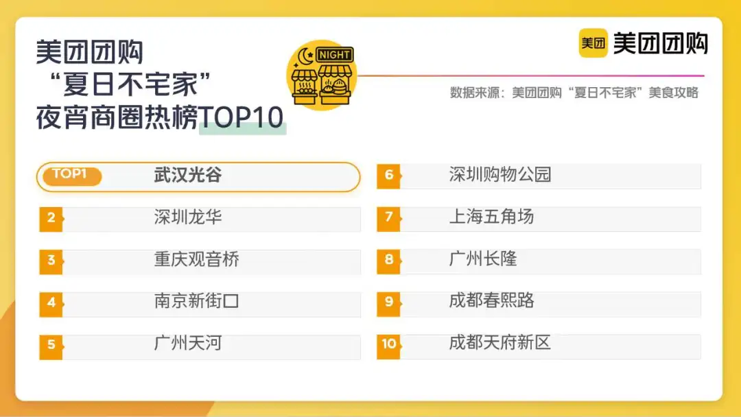 夏日不宅家,避暑不避欢。今年暑期,“昼伏夜出”正在成为餐饮消费新宠,各地夜宵市场愈加火热。近日,美团团购发布“夏日不宅家”美食攻略。美团团购数据显示,夏至以来,武汉光谷、深圳龙华、重庆观音桥、南京新街口、广州天河、深圳购物公园、上海五角场、广州长隆、成都春熙路、成都天府新区的夜间逛吃客流持续领跑,成为全国十大热门夜宵商圈。