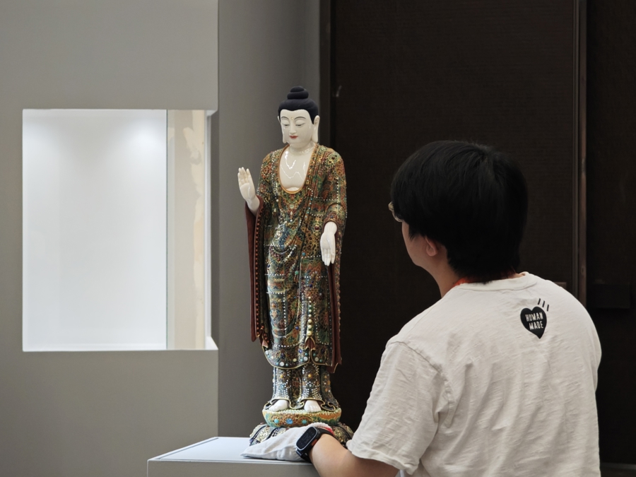《极彩·如愿佛》是中国工艺美术大师连紫华的作品。作品用徳化最优质的象牙瓷作原料手工制作烧制而成,再用纯天然的矿物质手工彩绘,将白瓷烧制技艺和唐卡绘画工艺两种国家级非遗项目结合,加上几十种、数千颗天然珠宝镶嵌,恰似《妙法莲华经》中“金、银、琉璃”等合成璎珞的妙意。这种创新,打破了德化瓷“单一白”的固有印象,世界陶瓷史上尚属首创。