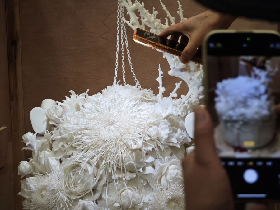 创造了不俗热度的《神话》,是福建省工艺美术大师连德理的作品。它以电影《神话》中玉漱公主为原型,以中国古典美学为魂、白瓷工艺为骨,将东方女性的温婉典雅与神话意境相融,一经亮相便凭借细腻造型与独特神韵圈粉无数。在制作这件作品长达半年的探索中,连德理至少经历了上百次的失败,最终他运用自主研发的“高韧薄胎瓷衣技艺”,成功将瓷衣厚度控制在0.2毫米,让坚硬陶瓷化作绕指柔纱,远观似云霭流风,近触方知瓷骨铮铮;光影在蝉翼般的衣袂间游走,千年工艺与银幕美学在此刻共舞生辉。