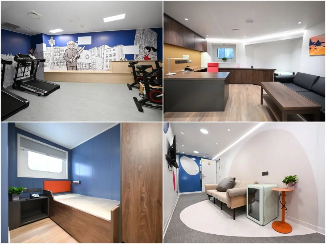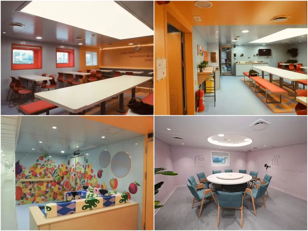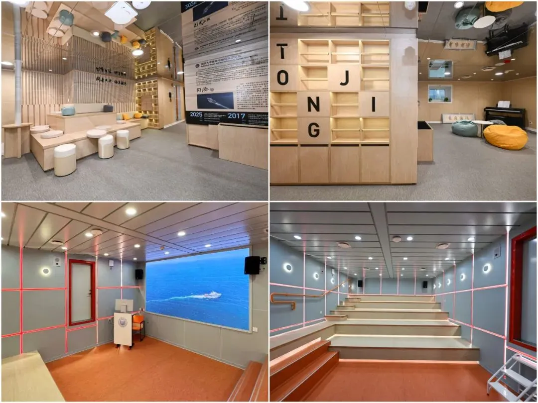 由同济大学设计创意学院负责的外形与内装设计,也是“同济”号的一大亮点。船体外观飘逸轻盈,像一个时尚的现代建筑,船内明快的色调、清新的装饰、个性化定制,令人顿感舒适惬意,如同“社区”和“家”一般温馨。舱内设置宽敞明亮的餐厅、休闲区及健身空间,并引入自然光照设计,缓解长期封闭环境带来的压抑感。全船采用高效隔音材料和减振系统,显著降低机舱噪音对生活区的影响。工作区自动调节温湿度、照明亮度,保证工作环境舒适。全船覆盖高速卫星网络,支持师生与家人高清视频通话。