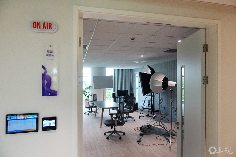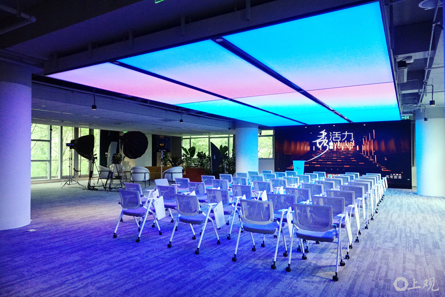 “V聚场”三楼打造多个特色场景,集办公、培训、直播等多功能于一体,配置专业摄影棚、配音室、特效制作中心等共享设施,为入驻企业营造良好环境。