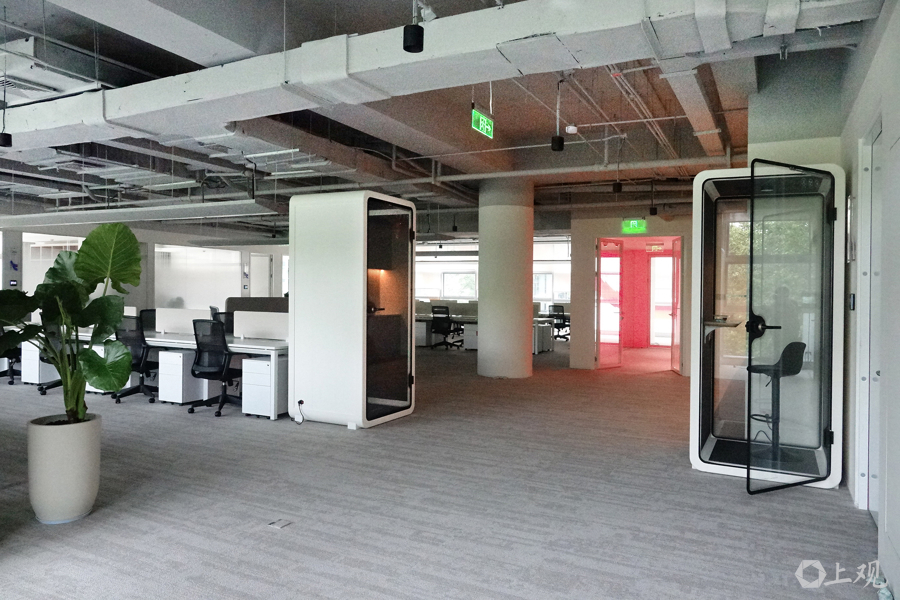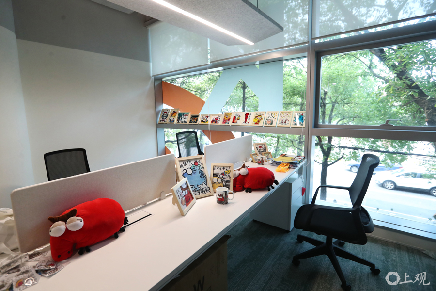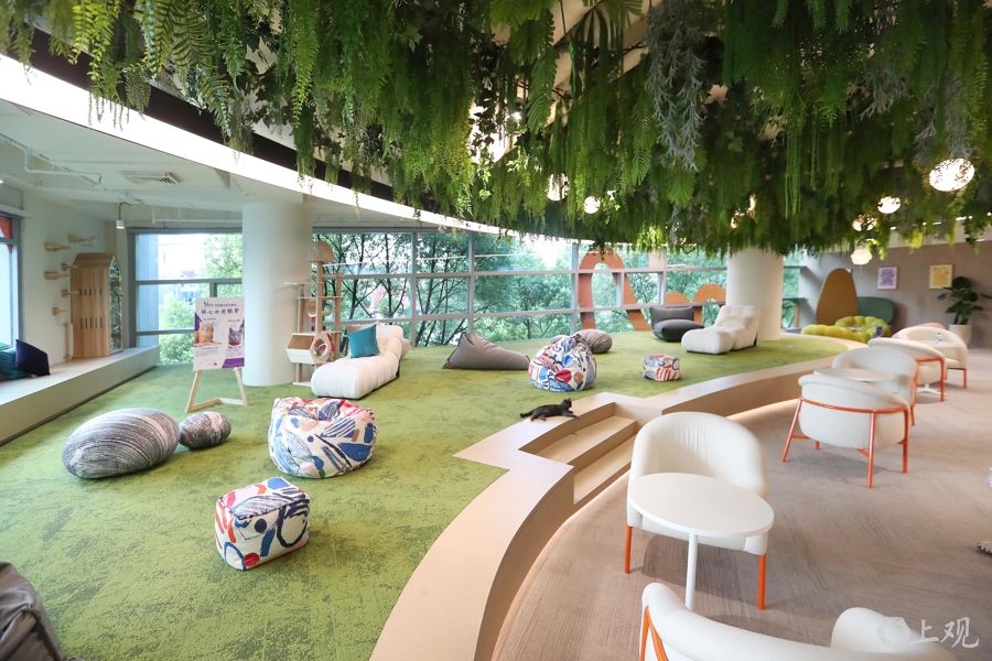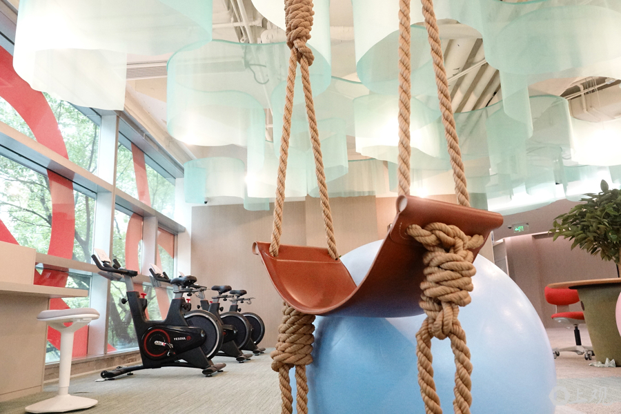 整个空间配备3个直播间,有访谈文化类的,有科技风的,还有一个绿幕直播间,满足内容创作者需求。场内有多个休息区域,可以提供工作之余的身心放松空间,有健身交流区,休息区配备了各种沙发,睡眠舱等。值得一提的是,运营团队还安排了两名“猫”员工,给创作者激发灵感和提供减压服务。