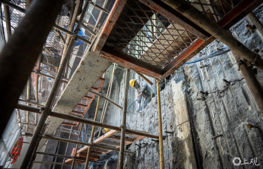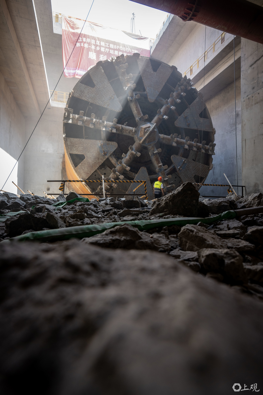 “建安号”盾构机的刀盘缓缓露出真容,工作人员查看刀盘附近情况。