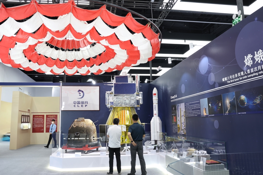 嫦娥五号返回器、降落伞和钻取采样装置均亮相本次展览。