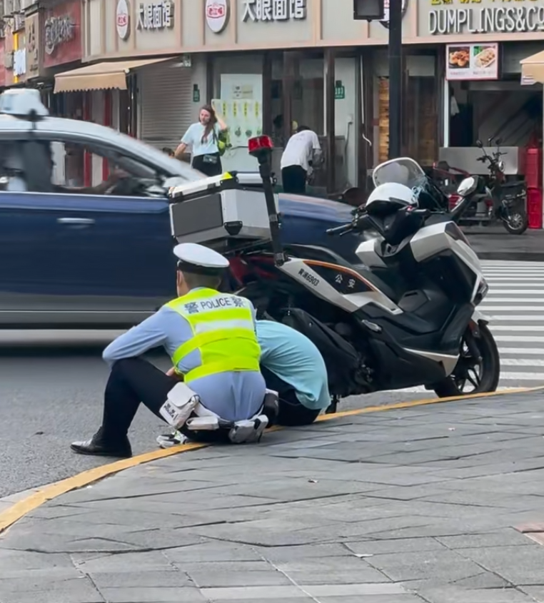 黄浦公安分局交警李佳梁执勤时遇哭泣男孩,席地而坐耐心安抚