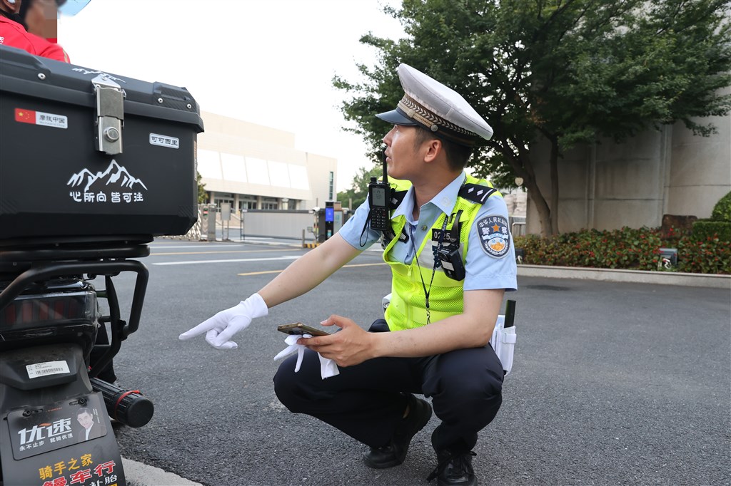 徐汇交管民警对快递小哥未按规定使用悬挂专用号牌的电动自行车的违法行为进行纠正和处罚(上海警方供图,下同)