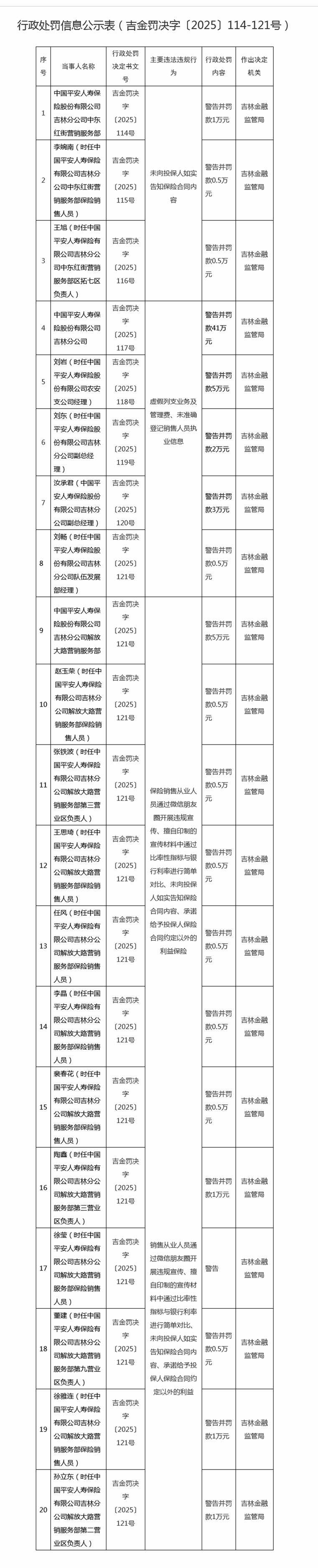 中国平安人寿保险股份有限公司吉林分公司因虚假列支业务及管理费、未准确登记销售人员执业信息被警告并罚款41万元。