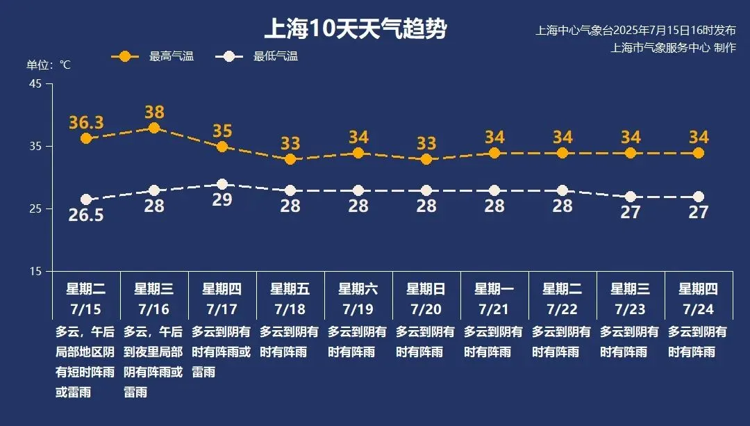 周四上海受暖气团控制,最高气温继续维持在高温线上下,时不时还会有雷阵雨出没。周五起,受海上的偏东气流影响,上海的高温得以缓解,蓝天、白云、散装阵雨随机切换。由于湿度大,“闷蒸”体感上线。
