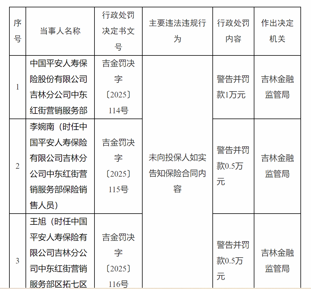 中国平安人寿保险股份有限公司吉林分公司中东红街营销服务部,因未向投保人如实告知保险合同内容,被警告并罚款1万元。